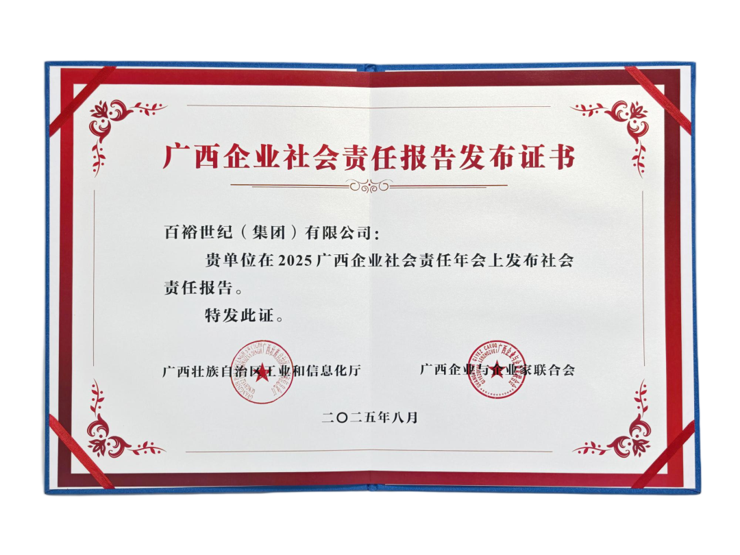 8月27日,由自治區(qū)工業(yè)和信息化廳、廣西企業(yè)與企業(yè)家聯(lián)合會共同主辦的2025廣西企業(yè)社會責(zé)任年會在南寧隆重舉行。會上發(fā)布了百裕集團2024年度社會責(zé)任報告。廣西企業(yè)社會責(zé)任報告發(fā)布會旨在為廣西企業(yè)提供社會責(zé)任展示和交流平臺,建立社會責(zé)任信息披露制度和監(jiān)督評價機制,樹立典范、營造氛圍,推動形成政府、行業(yè)、企業(yè)、社會“四位一體、多元促進”的協(xié)同推進格局,促進企業(yè)實現(xiàn)高質(zhì)量發(fā)展,推動經(jīng)濟社會的全面協(xié)調(diào)可持續(xù)發(fā)展。